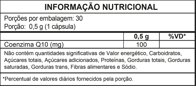 INGREDIENTES: Coenzima Q10, estabilizantes celulose microcristalina e amido, antiumectante dióxido de silício. Ingredientes da cápsula: Gelatina,corante dióxido de titânio e água potável filtrada. NÃO CONTÉM GLÚTEN.